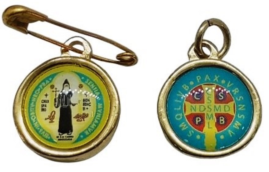 Medalla dorada doble cara con gancho – con imagen y cruz de San Benito en colores, resinada / Diámetro 1,3 cms. / Valor es por unidad