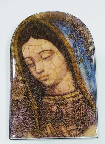 Cuadro de madera con imagen de Virgen de Guadalupe. Incluye gancho para colgar. Medidas: 11.5 x 17.5 cms.