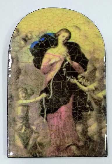 Cuadro de madera con imagen de Virgen Desatanudos. Incluye gancho para colgar. Medidas: 11.5 x 17.5 cms.
