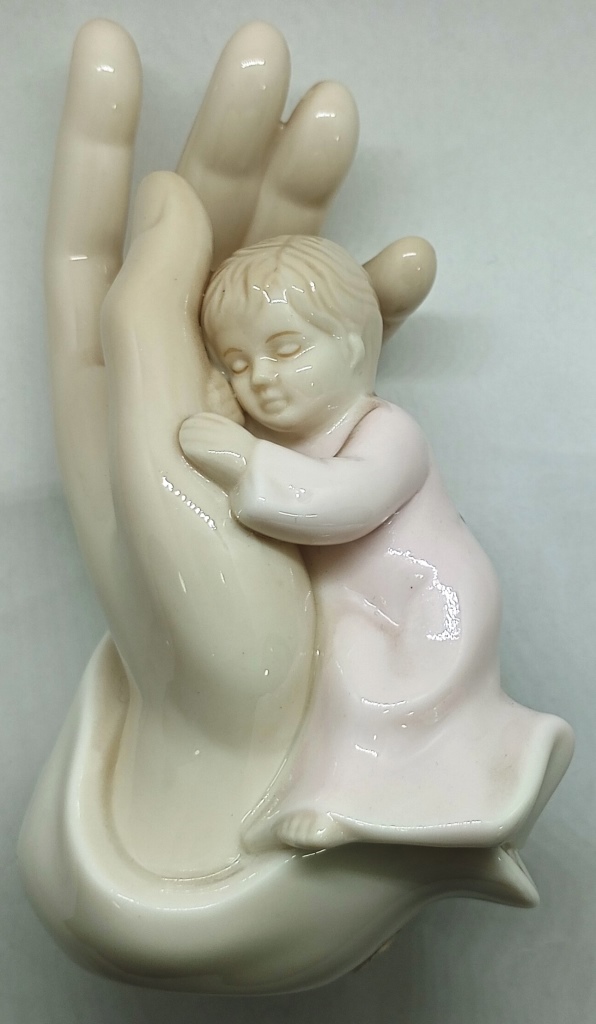 Imagen de niña durmiendo en la mano de Dios, color blanco y rosado / elaborado en cerámica brillante / Dimensiones: 12,5 x 7 cms.