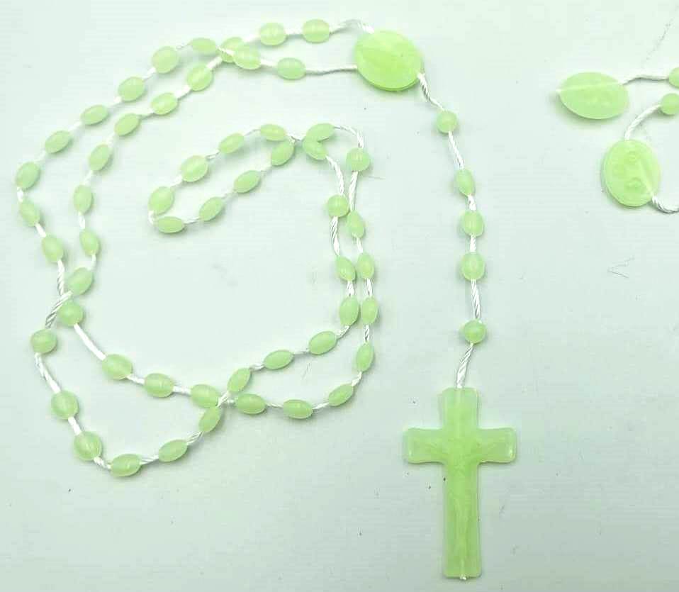 Rosario de cuentas fluorescentes, en la oscuridad se distingue por este efecto de luminosidad / Marieta doble que sirve para abrir el rosario y colgar al cuello / Materialidad: cuentas acrílicas hiladas / Largo total cerrado: 42 cms.