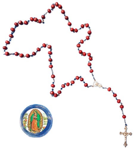 Rosario cuentas rojas en caja acrílica circular / Marieta con imagen de Virgen / materialidad: acrílico y detalles metálicos / imagen de caja surtidas / Dimensiones: largo total rosario: 47 cms. – Caja acrílica 5,5 cms. diámetro