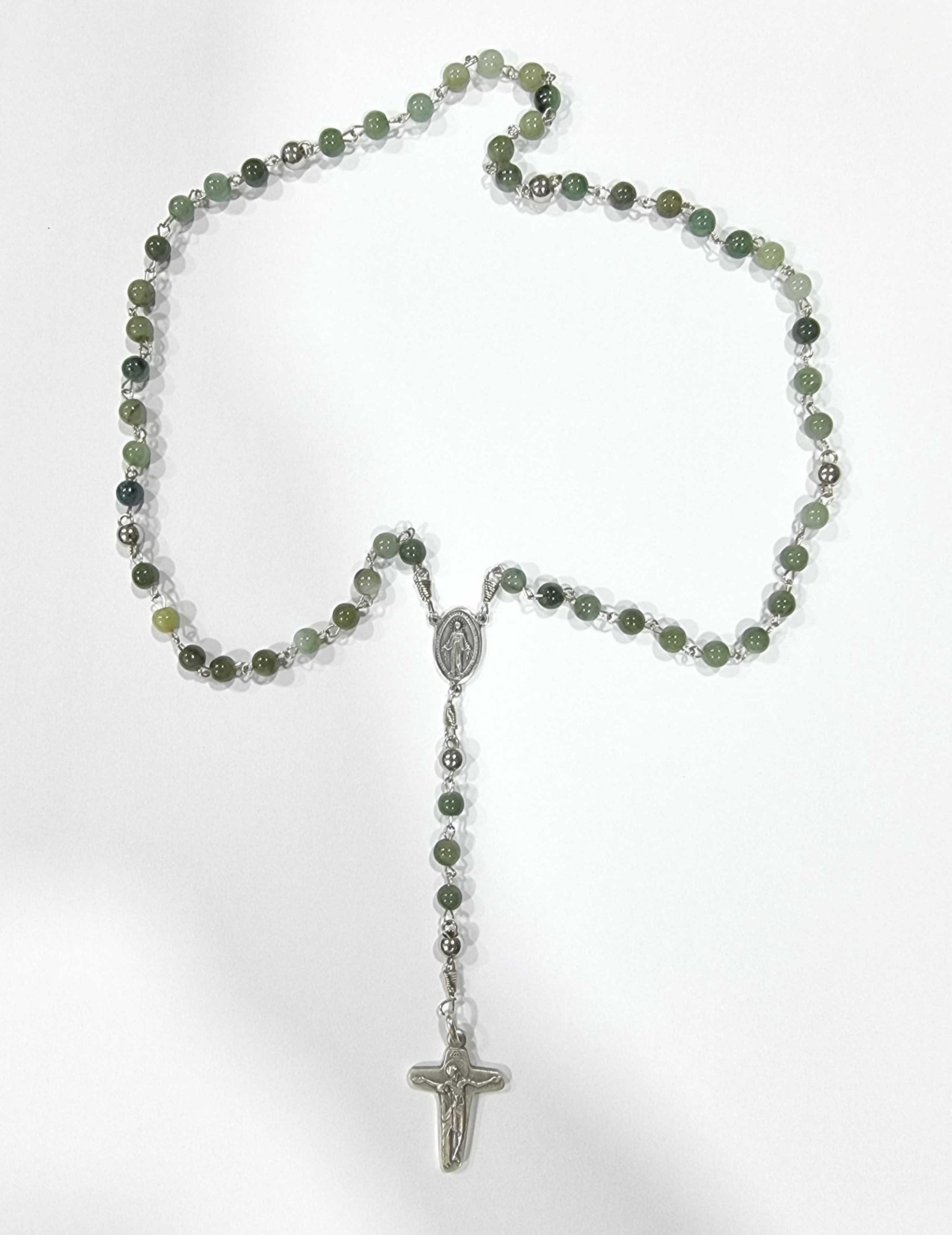 Rosario en piedra Jade verde original importado de China, dimensión esfera 4mm. Cruz de la Unidad y Marieta (medalla central) en plata de 925, tejido del alambre en metal de alpaca y esferas en acero inoxidable. Largo total 40 cms. aprox.