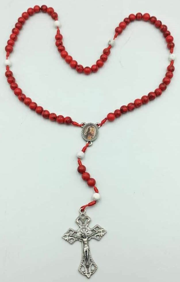 Rosario especial de 12 cuentas por misterio, para el rezo a la preciosÍsima sangre de cristo / cuentas en piedra natural de 5 mm. / marieta y cruz metálica de fantasía / largo total 34 cms.