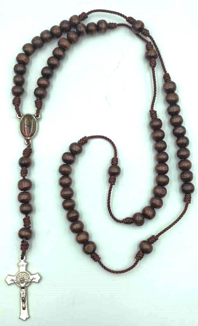 Rosario con cuentas de madera (6 mm) hilado en macramé / Marieta metálica con imagen resinada de Virgen Guadalupe, dimensiones 1,5 x 1 cms. / Cruz metálica con Cristo y medalla San Benito – en fantasía color plata