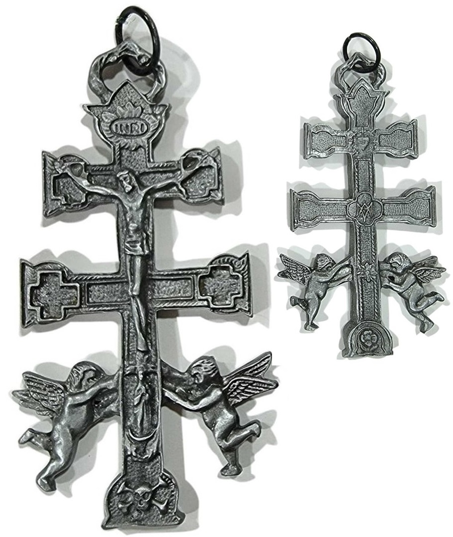 Cruz metálica Santísima Cruz de Caravaca doble cara, para colgar / color plata / medida 10,5 x 5,5 cms. / venta es por unidad