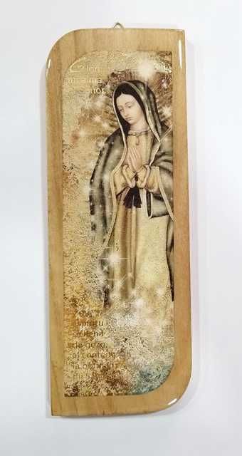 Tabla de madera con imagen resinada efecto vidrio de la Virgen de Guadalupe Medidas: 20.5 x 7.5 cm con escrito de rezo: “Glorifica mi alma al Senor y mi espiritu se llena de gozo al contemplar la bondad de Dios mi salvador”