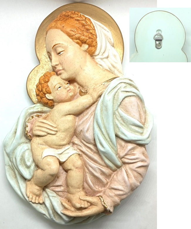 Imagen Virgen de la ternura con niño, para colgar / Material: yeso pintado a mano y sellado / 18,5 x 12 cms. / *artículo no recomendado para exteriores